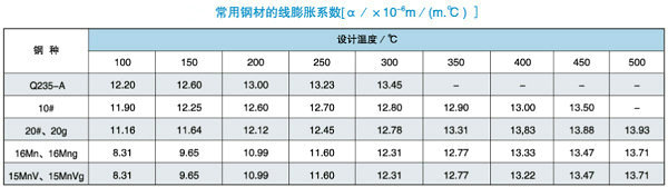 α—管材的線膨脹系數(shù);L—直管段長度;t1—管道安裝設(shè)計(jì)溫度;t2—管道內(nèi)介質(zhì)溫度;常用鋼材線膨脹系數(shù)如下圖(2):