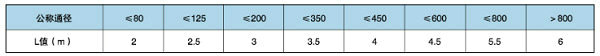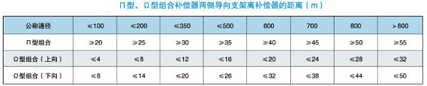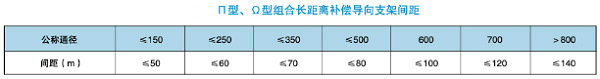 因旋轉(zhuǎn)補(bǔ)償器的補(bǔ)償量特別大,所以固定支架間距也隨之增大,其間距一般由設(shè)計(jì)管段的補(bǔ)償量大小決定,為避免長距離管道撓曲失穩(wěn),需在一定距離內(nèi)安裝導(dǎo)向支架,同時為減小管段運(yùn)行的摩擦阻力,在導(dǎo)向支架上應(yīng)安放滾動支座,導(dǎo)向支架間距如下表:圖(8)